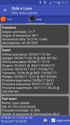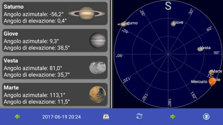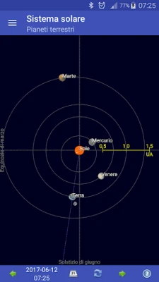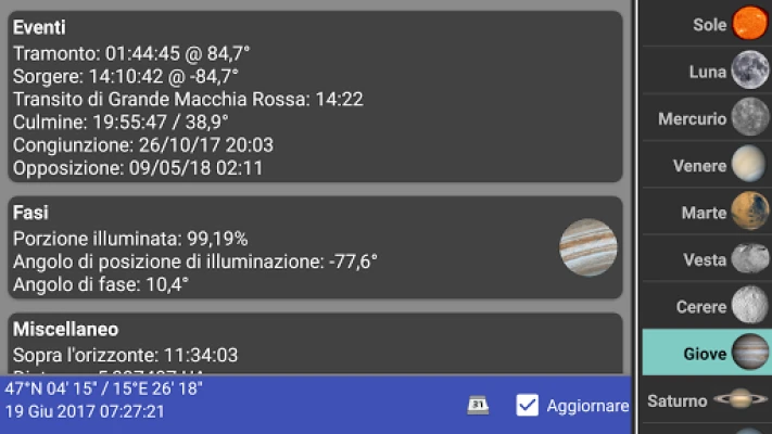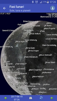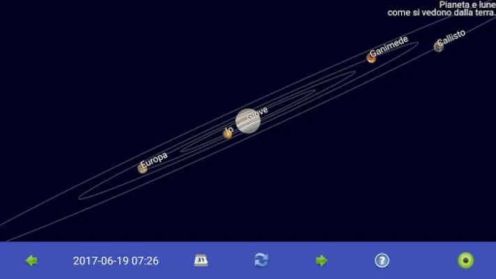 Con una precisione sorprendente, potrai monitorare la distanza dalla Terra di vari oggetti, calcolare l'esatta lunghezza del giorno e seguire l'affascinante evoluzione della fase lunare, giorno dopo giorno. Ma non è tutto: immergiti in visualizzazioni grafiche mozzafiato che mostrano la fase lunare attuale con chiarezza cristallina, quali oggetti sono visibili sopra l'orizzonte nel tuo preciso momento e la disposizione in tempo reale dei pianeti del nostro Sistema Solare. Avventurati ancora più a fondo per osservare le intricate orbite delle lune di Giove e Saturno, così come le posizioni delle lune di Marte, Urano, Nettuno e persino Plutone, tutte rappresentate come le vedresti dalla Terra.
